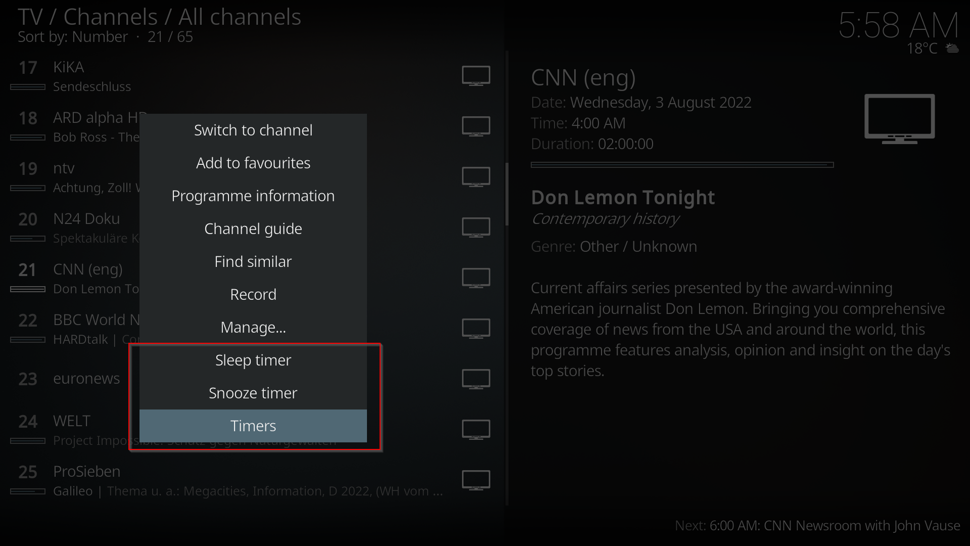 - Timers can play any resource that it available in Kodi, e.g. music folders, video files, TV/radio programs, slideshows, ressources from 3rd party plugins, e.g. Zattoo channels.