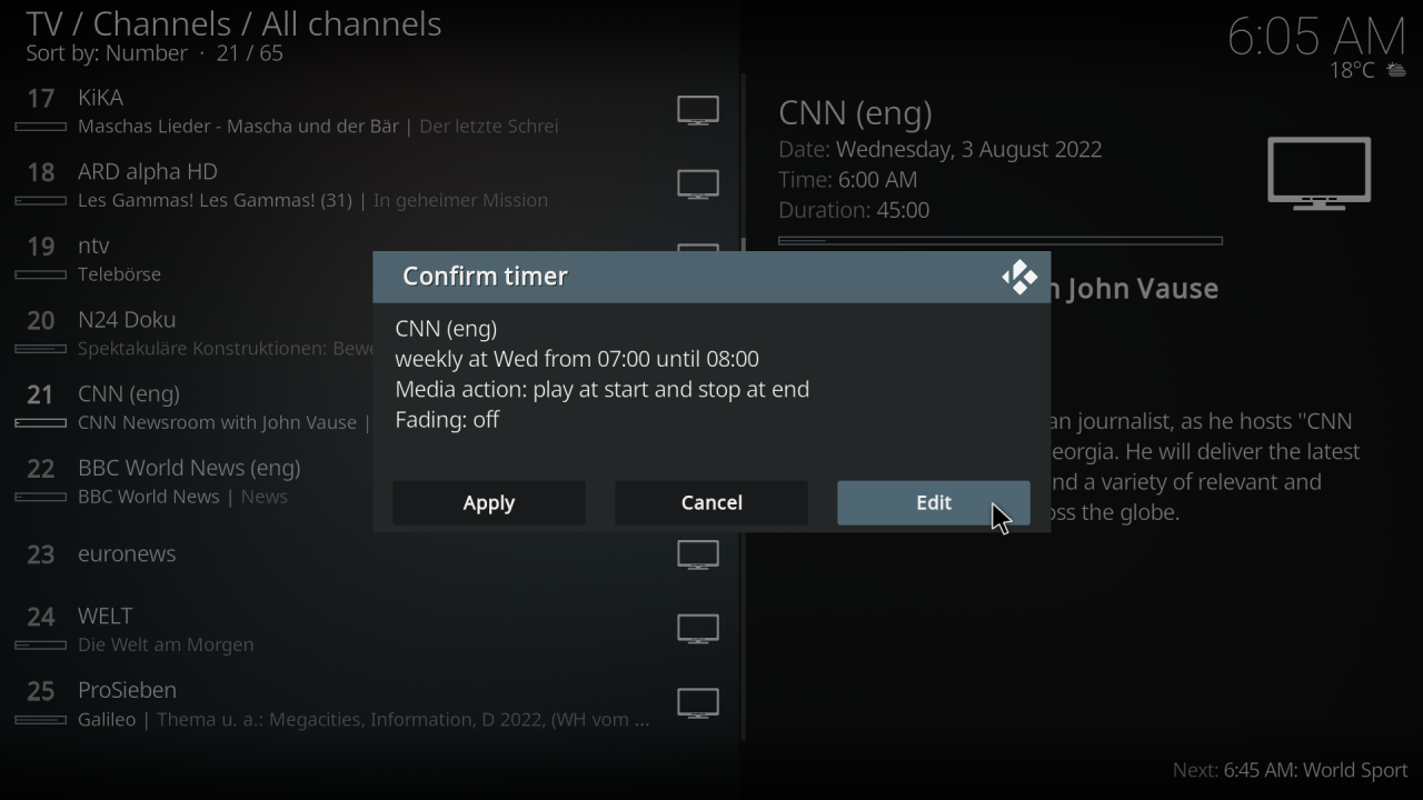 - After KODI startup timers, that are in period, start retroactivly although KODI was not running at start time. Fading volume is calculated correctly.
