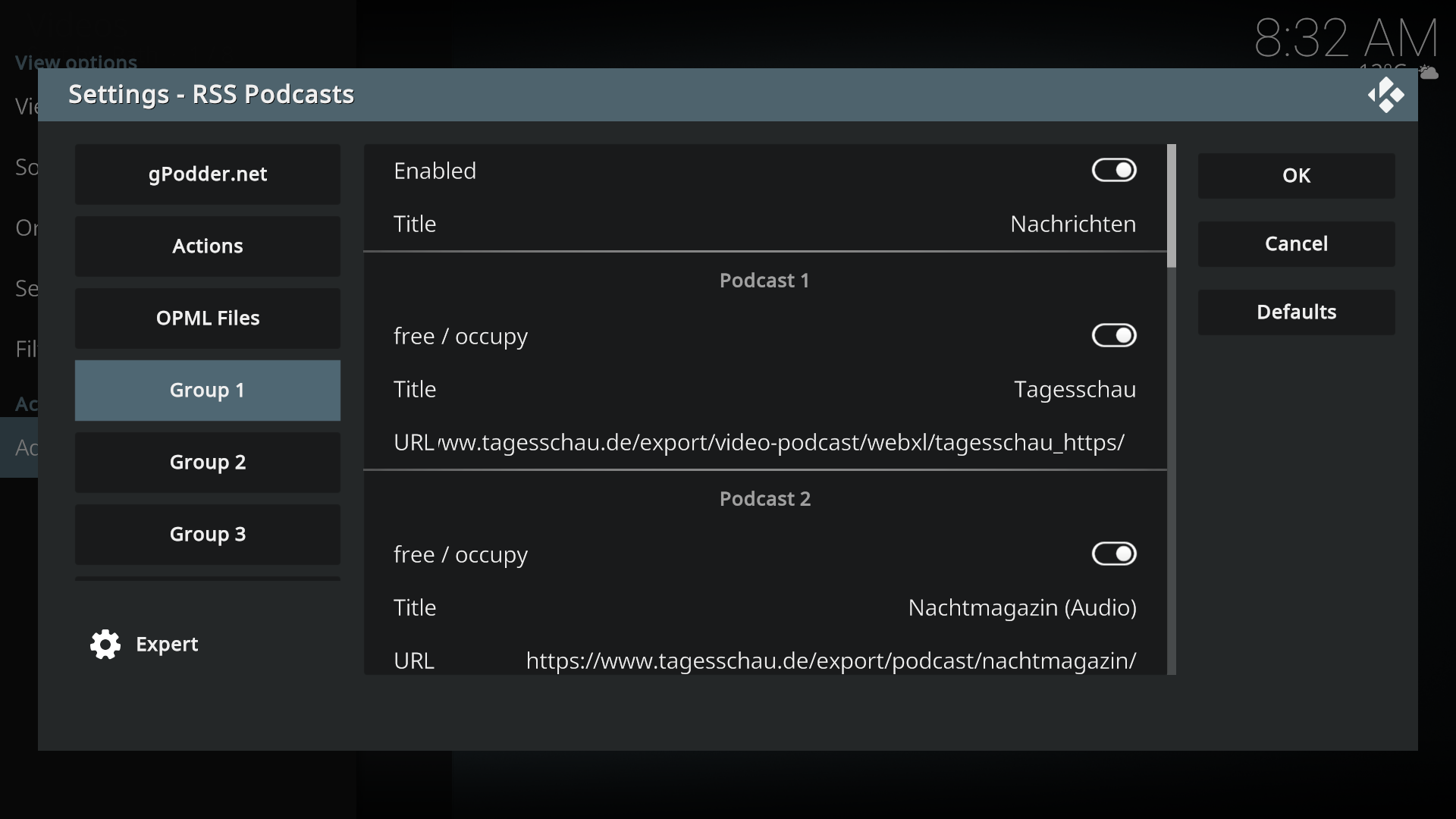 This addon allows to import your audio and video podcasts from gPodder.net or from OPML files. You can make use of up to 10 categories in order to manage your podcasts. You can also directly enter the URLs of your podcasts or attach up to 10 OPML files directly.