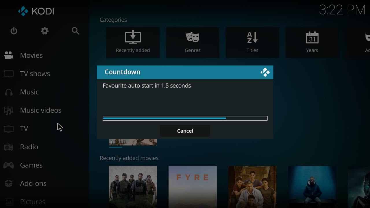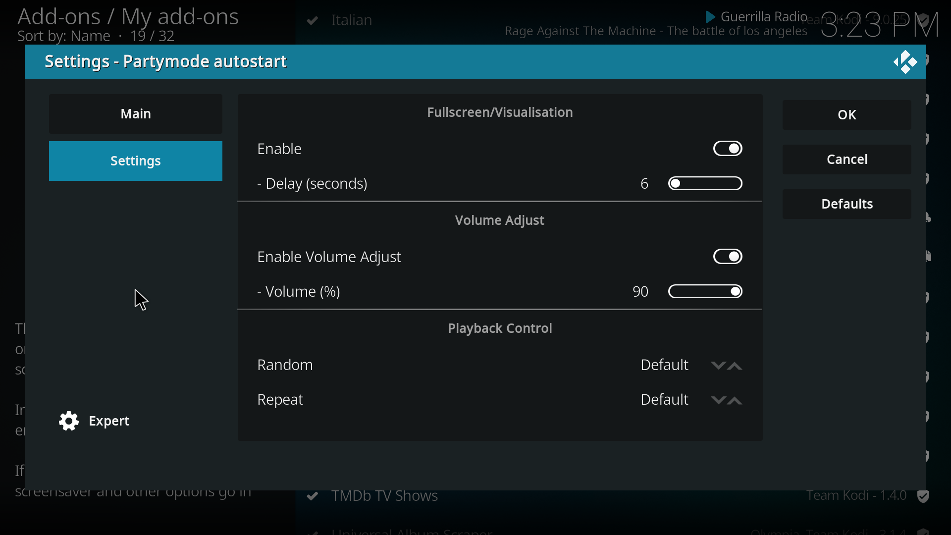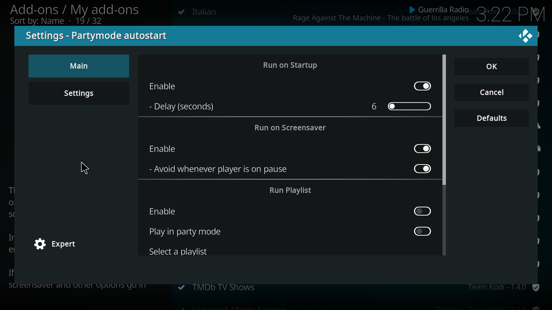 This service simply executes party mode or favourites on Kodi startup or on screensaver.