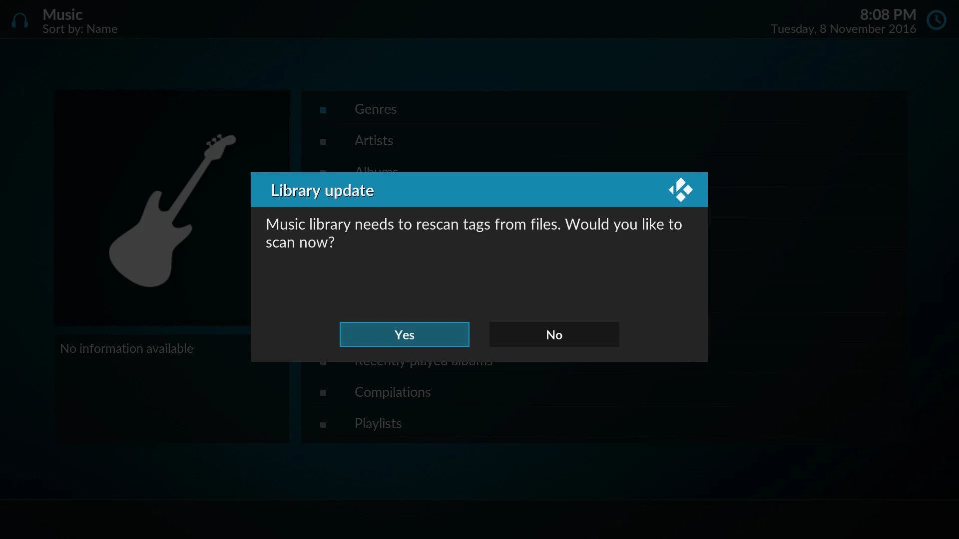 With Kodi v17 a lot has changed in regards to the music library and part of this has been better tag scanning and usage. For this to work to it’s full potential it’s mandatory for your music files to be re-scanned and the available tags to be extracted. After you upgrade and enter the music library a choice will be giving to re-scan now or later. As this re-scan can take up quite some time and resources you can answer NO and continue browsing your library. Once you exit library and re-enter you will be prompted again asking to re-scan. Once you answer YES Kodi will start scanning all your music files and extract the tag data they contain to a certain degree. As mentioned this process takes quite some time depending on the size. During this time Kodi might be somewhat slower than normal. Do note that this will not reset your library to a new state or that you will loose data. It will simply update what is available and will leave all play counts and the rest as they were.
