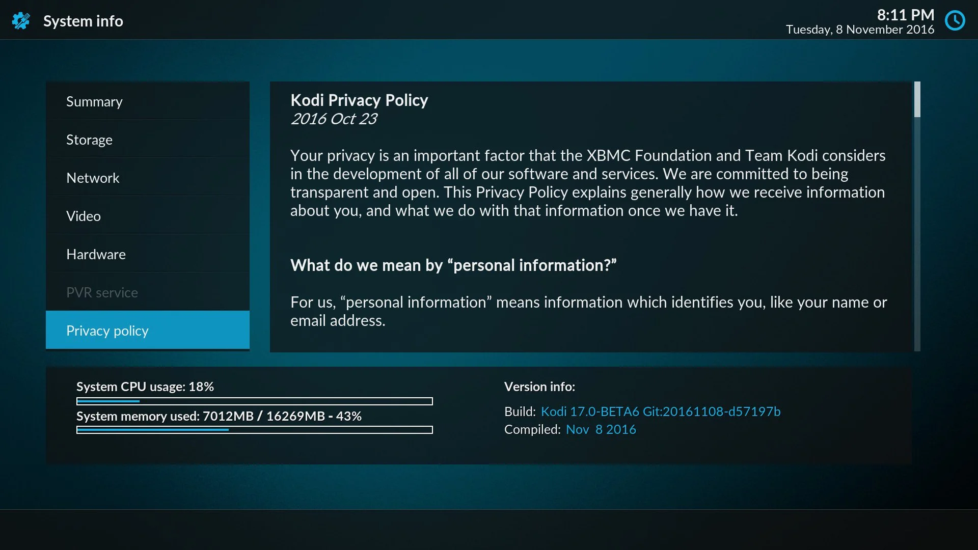 Your privacy is an important factor that the XBMC Foundation and Team Kodi considers in the development of all of our software and services. We are committed to being transparent and open. This Privacy Policy explains generally how we receive information about you, and what we do with that information once we have it. As such we have added this privacy policy to our website and also made it available from within Kodi itself to read.